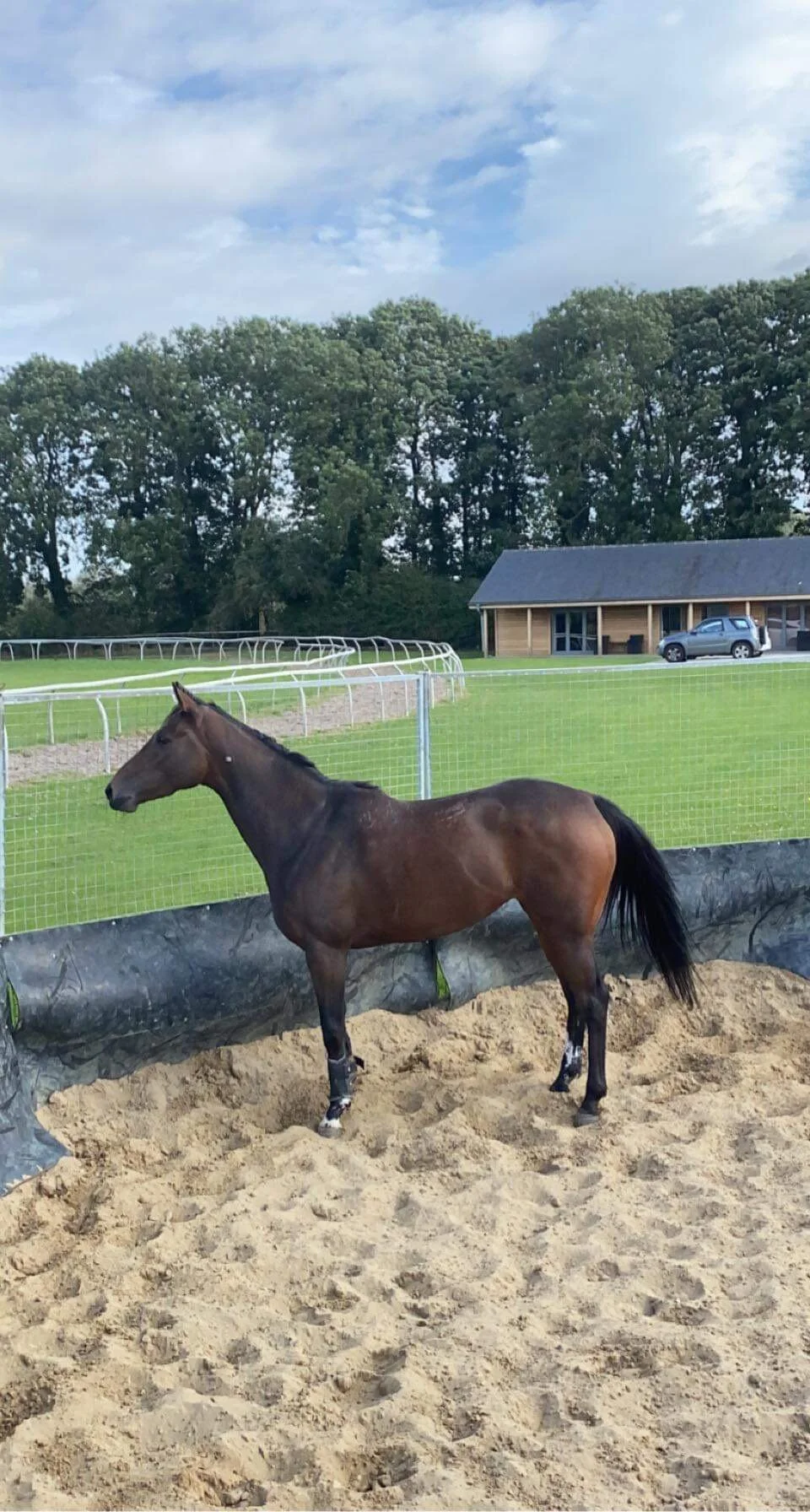 We turn horses out daily in our deep sand pen. We turn a lot of the horses out after they run. It allows them to have a play and a roll in a safe environment.